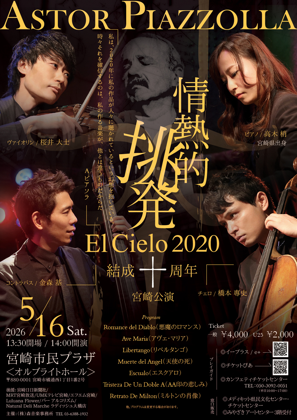 | 説明 | エルシエロの結成10周年となる2025年の締めくくり、そしてピアソラCDの最終章となる新作『Astor Piazzolla Ⅲ』のリリース記念コンサートはエルシエロでは初となるサントリーホール・ブルーローズで開催。ピアソラの最深部に迫るプログラムは、ピアソラの最後の作品であり最大にして最高傑作「La Camorra」全3部作、20分に迫る超大作「AA印の悲しみ」,ピアソラで最も美しい旋律を持つ「悪魔のロマンス」など、これ以上なく熱い音楽が繰り広げられます。 |