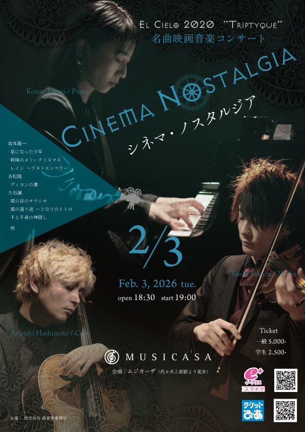 | 説明 | El Cielo 2020のメンバー、高木梢(ピアノ),桜井大士(ヴァイオリン),橋本專史(チェロ)による映画音楽のコンサートの第二弾。おもに海外の映画音楽を中心とした前回の「シネマ・ノスタルジアⅠ」に対し、今回は日本の映画音楽を中心の演奏。坂本龍一「戦場のメリークリスマス」「レイン」「星になった少年」の他、ジブリ映画より「風の谷のナウシカ」「千と千尋の神隠し」、吉松隆「ヴィヨンの妻」、武満徹の作品など、記憶に残る美しい映画音楽の数々を演奏していきます。映画音楽CDの第二弾「シネマ・ノスタルジアⅡ ~宿命~」もコンサート当日に先行発売します。 |